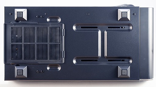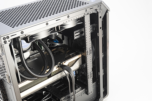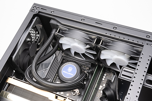 CPUクーラーは,240mmサイズのラジエータを使うMSI製の簡易液冷ユニット「MAG CORELIQUID E240」を天板裏面に配置する。そのほかに,140mm径の吸気ファンと,排気ファンを1基ずつ備える。底面側に独立したファンはなく,電源ユニット内蔵のファンを使う仕様だ。