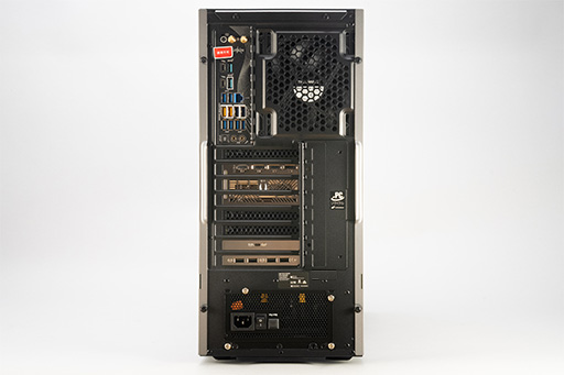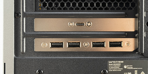 盛りだくさんのUSBポートを見ていこう。合計23基のUSBポートは,フロントに4基と,背面に19基割り振られている。背面側のうちUSB 2.0 Type-Aの4つと,USB 3.2 Gen 2 Type-Cの1つは,マザーボードのI/Oパネル部分ではなく,拡張カードスロット側にある。