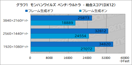 グラフ1は,モンハンワイルズ ベンチの総合スコアをまとめたものだ。フレーム生成オンの状態では,スコアが大幅に低くなっているが,これは本ベンチマークの仕様である。