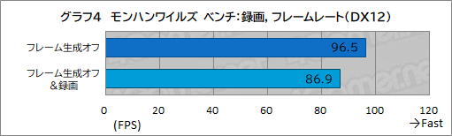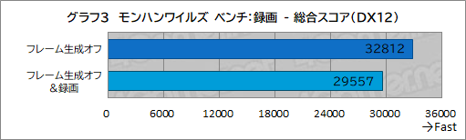1440pでフレーム生成オフ,録画なしの状態と録画ありの状態で,総合スコアを比較したのがグラフ3,平均フレームレートを比較したのがグラフ4だ。