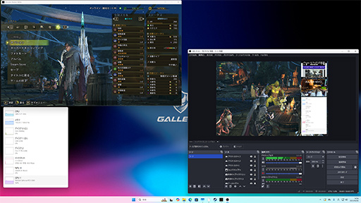 モンハンワイルズで,比較的一定の高い負荷が持続する「大集会場」の様子を,OBS Studioで録画するというものだ。ゲーム映像だけでなく,USBビデオキャプチャデバイスの「GC551G2」で筆者所有の「iPhone16 Pro Max」の映像もキャプチャしながら,Webカメラの「Razer Kiyo」で撮影したカメラ映像も重ねて表示させた。