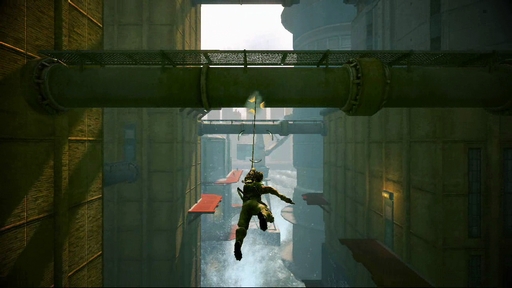 本作の最大の特徴は,主人公の左腕の“バイオニック・アーム”を使ったさまざまなアクションだ。今回公開されたムービーでは,左腕から伸びるワイヤーアンカーを使ってフィールドを縦横無尽に移動したり,巨大な物体を投げたり,敵を攻撃したりといったシーンがじっくりと見られる。なお,ムービー中に「□+×」といったコマンドのガイドが出ていることから,おそらくはPLAYSTATION 3版の映像だと思われる。