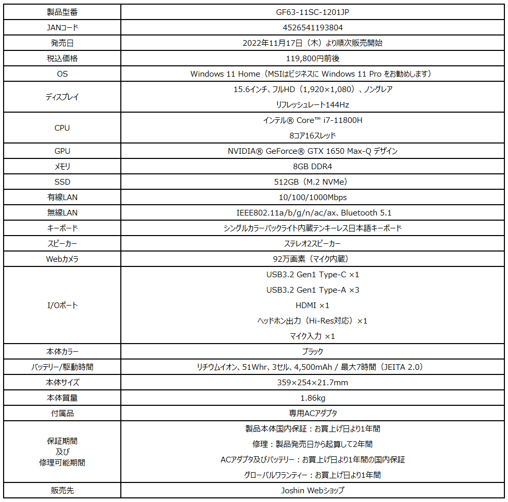 MSI,GTX 1650搭載で約12万円の15.6型ノートPCをJoshin web限定発売
