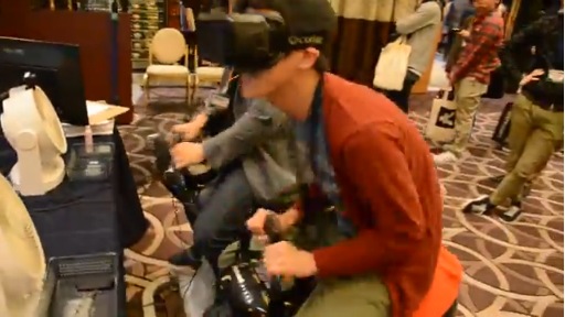被験者は,VR対応型HMDの代名詞ともいえるOculus VRのRift試作機,いわゆるDK2(Development Kit 2)を装着し,電動乗馬フィットネス器具にまたがります。足を鐙(あぶみ。足を掛ける場所)に乗せ,手綱に相当する器具を手で持って体験準備完了です。