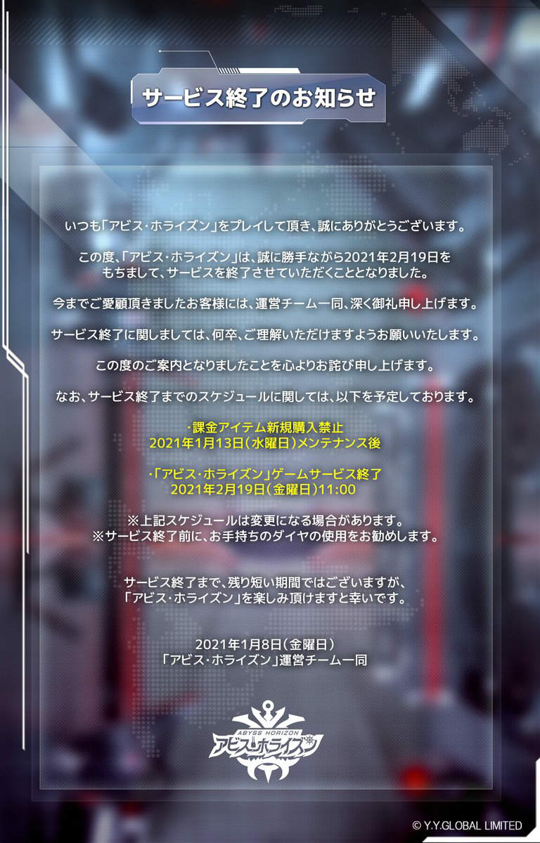 「アビス・ホライズン」が2021年2月19日にサービス終了