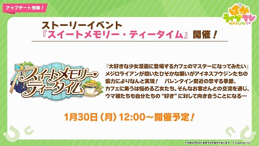 1月30日のアップデートでは,ストーリーイベント「スイートメモリー・ティータイム」が開催される。今回のイベントは“少女漫画に登場するカフェのマスター”に憧れるメジロライアンの夢を実現するため,仲間達が奔走する物語が展開される。