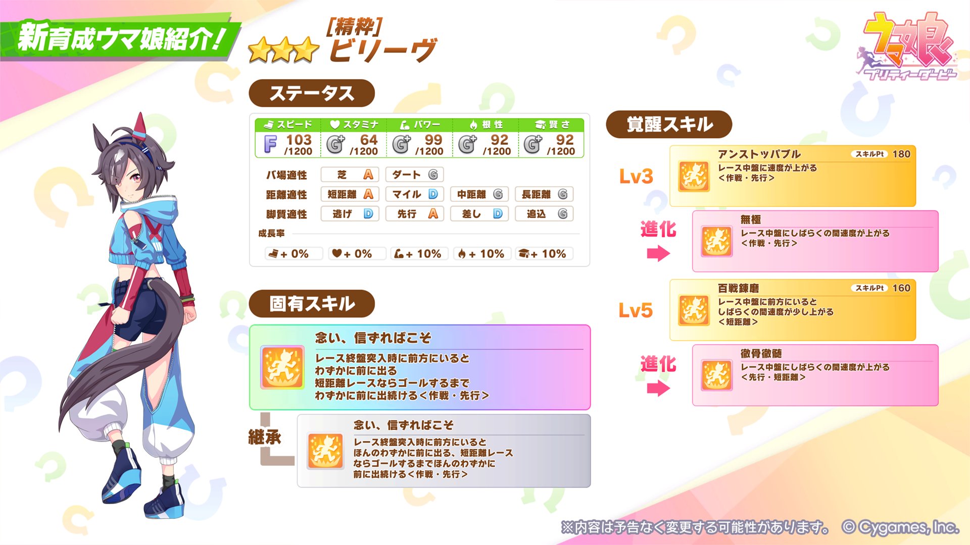 「ウマ娘 プリティーダービー」,新育成ウマ娘★3ビリーヴ(CV:秋山実咲)を9月19日12:00に実装。短距離に特化した職人気質のキャラ