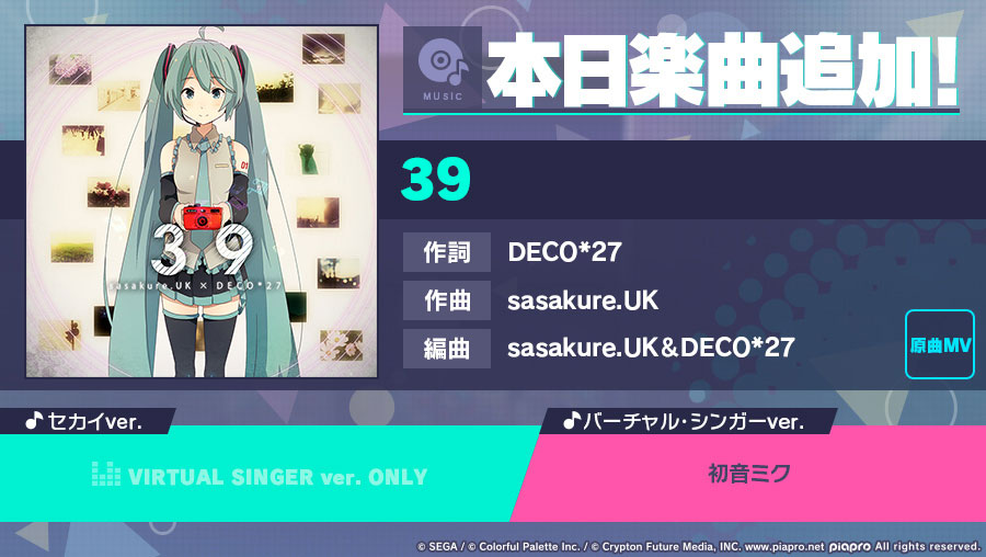 「プロジェクトセカイ カラフルステージ! feat. 初音ミク」,リズムゲーム楽曲として「39」を追加