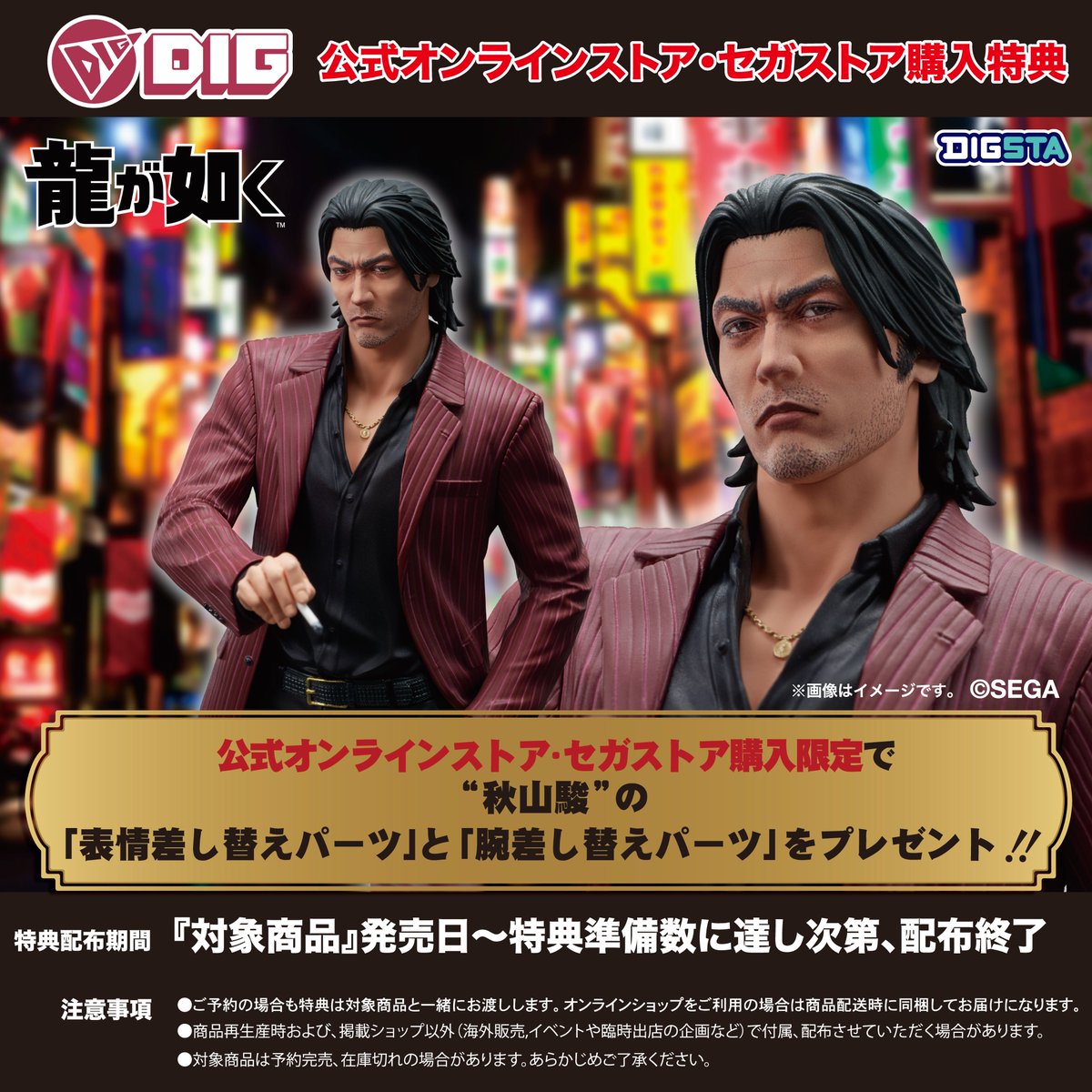 「龍が如く」シリーズのフィギュア「DIGSTA 『龍が如く』秋山駿」が11月30日に発売決定。特典として2種類の差し替えパーツを用意