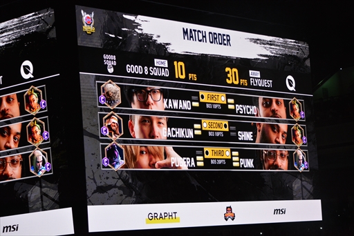 2巡目でアウェイ側に回ったGood 8 Squadは,大将のPunk選手を止めるためと思われる,先鋒ガチくん選手,中堅ぷげら選手,大将カワノ選手というオーダーを提出する。対するFlyQuestは,SHINE選手とはタイプが異なるキンバリー使いのPsycho選手を先鋒で送り込む(SHINE選手は攻め特化,Psycho選手はバランス重視とのこと)。