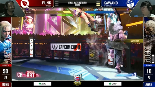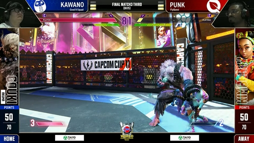 あとがなくなったGood 8 Squadだが,ここでカワノ選手が圧倒的なパフォーマンスを見せる。Punk選手のキャミィが仕掛けてくるキャノンストライクを豪昇竜拳でことごとく打ち落としてペースを握ると,地上戦でも圧巻の立ち回りを見せ,3連勝のストレート勝利を決める。