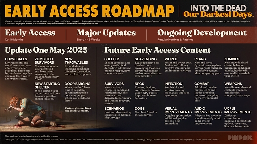 「Into the Dead: Our Darkest Days」のロードマップも公開されている。2025年5月中にはゲーム世界でのイベントが隠れ家に影響するようになり,ドアを蹴破るような新しいゲームシステムも搭載する予定だ。その後もサバイバーやシナリオ,エリアなどが追加される。