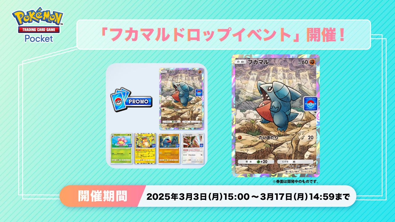 「ポケポケ」,フカマルなどを獲得できる「フカマルドロップイベント」を開始。イベントバトルに勝利し,プロモカードパックを手に入れよう