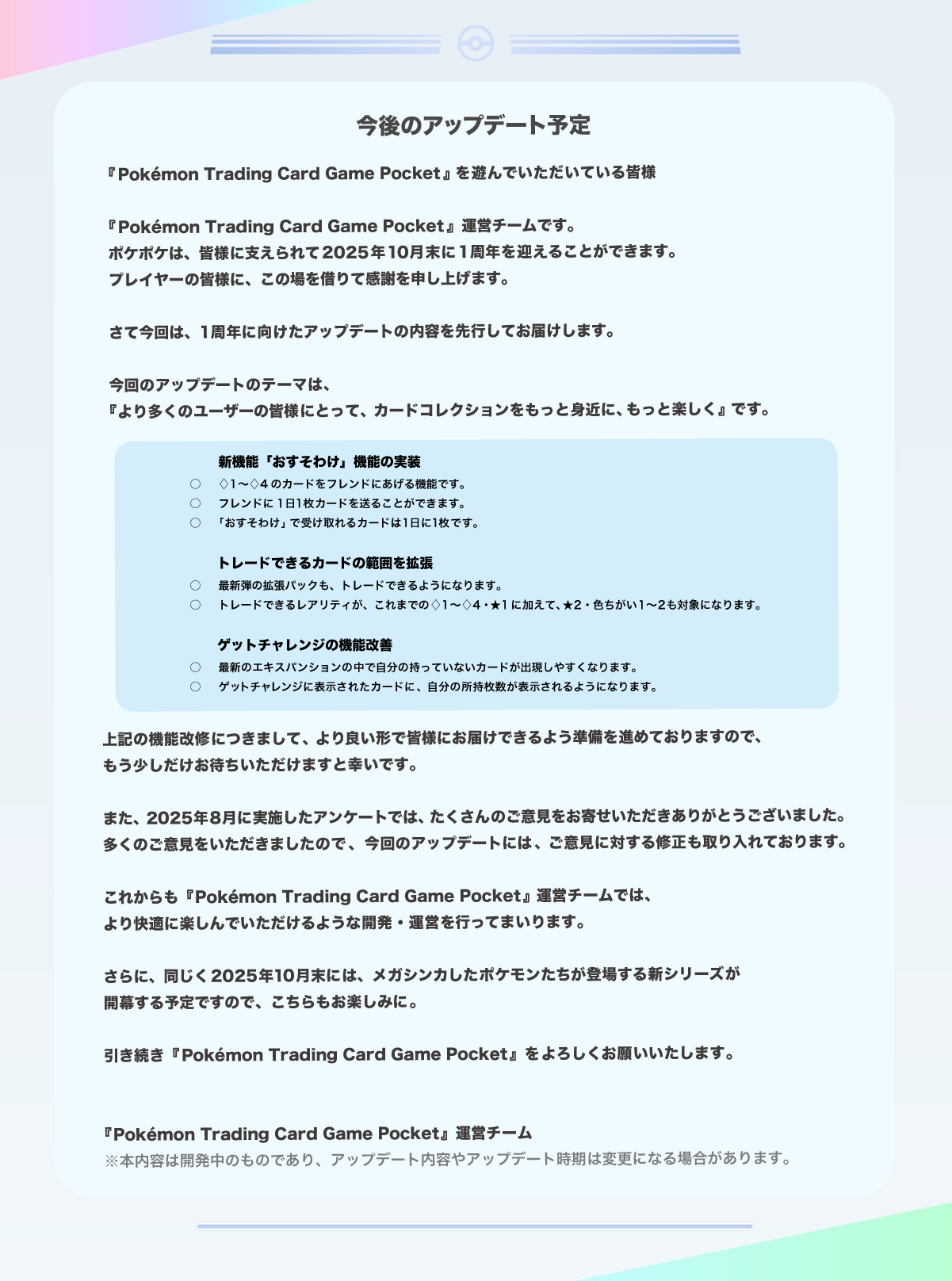 「Pokémon Trading Card Game Pocket」,今後のアップデート情報を公開。新たに「おすそわけ」機能が追加されるほか,機能の改善も
