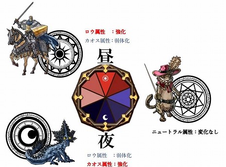 システムの詳細情報が明らかにされている。ロウ属性は昼に強く,カオス属性は夜に強くなる。ニュートラル属性は昼夜の変化を受けないといった,時間の変化を見極めることが勝利のカギになるという。