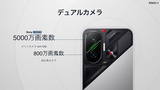 アウトカメラは,標準と広角という2眼式で,標準カメラは,有効画素数約5000万画素のソニー製撮像センサー「IMX882」を組み合わせる。AIを活用した画像補正機能により,自動で色味や明るさ,コントラストなどを調整できるそうだ。
