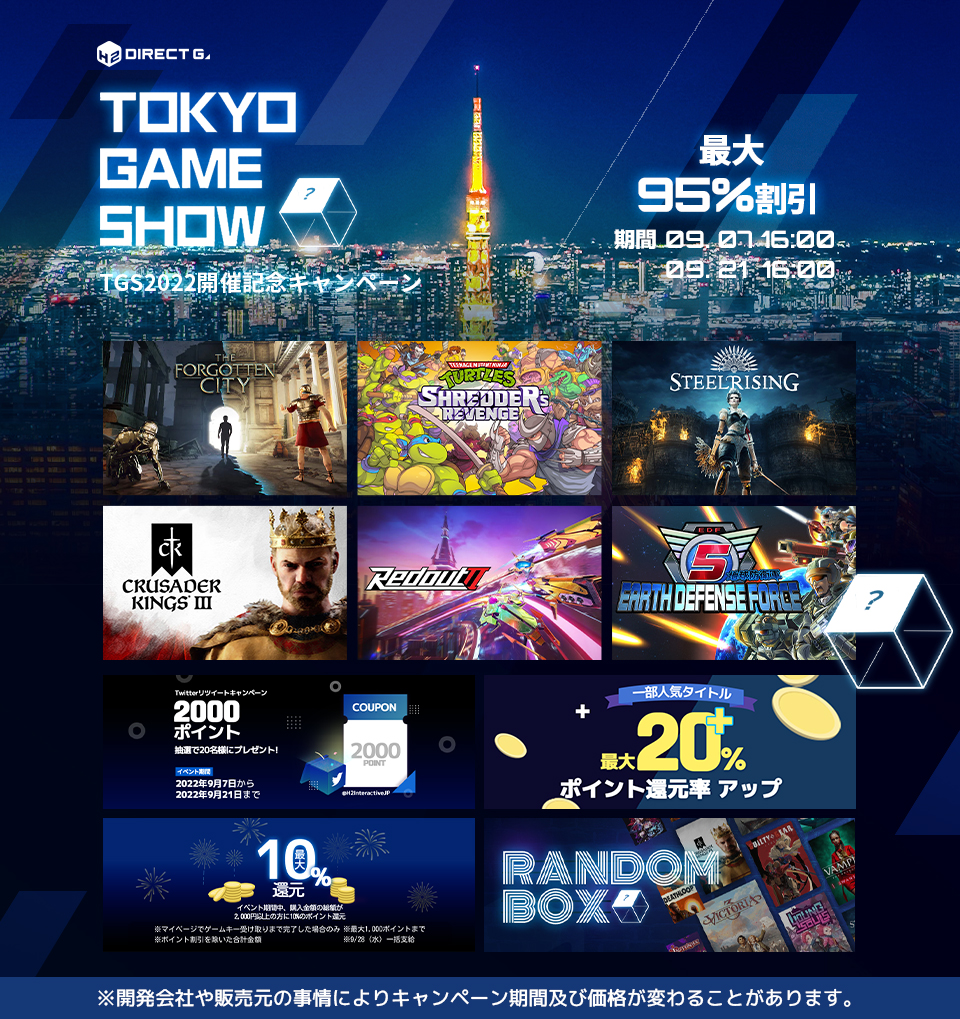H2 INTERACTIVE,“DIRECT GAMES TGS2022開催記念キャンペーン”を本日より開催。約820本が最大95%オフに