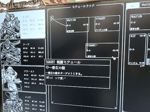 ゲームシステムは,冒険の拠点で迷宮探索用ゴーレムの「戦闘AI」「探索AI」をチューニングし,あとはゴーレムたちが迷宮を探索するのを見守るという,とても割り切ったデザインになっている。途中で撤退の指示を出すこともできるが,基本的には「準備して見守るだけ」のシンプルな内容だ。