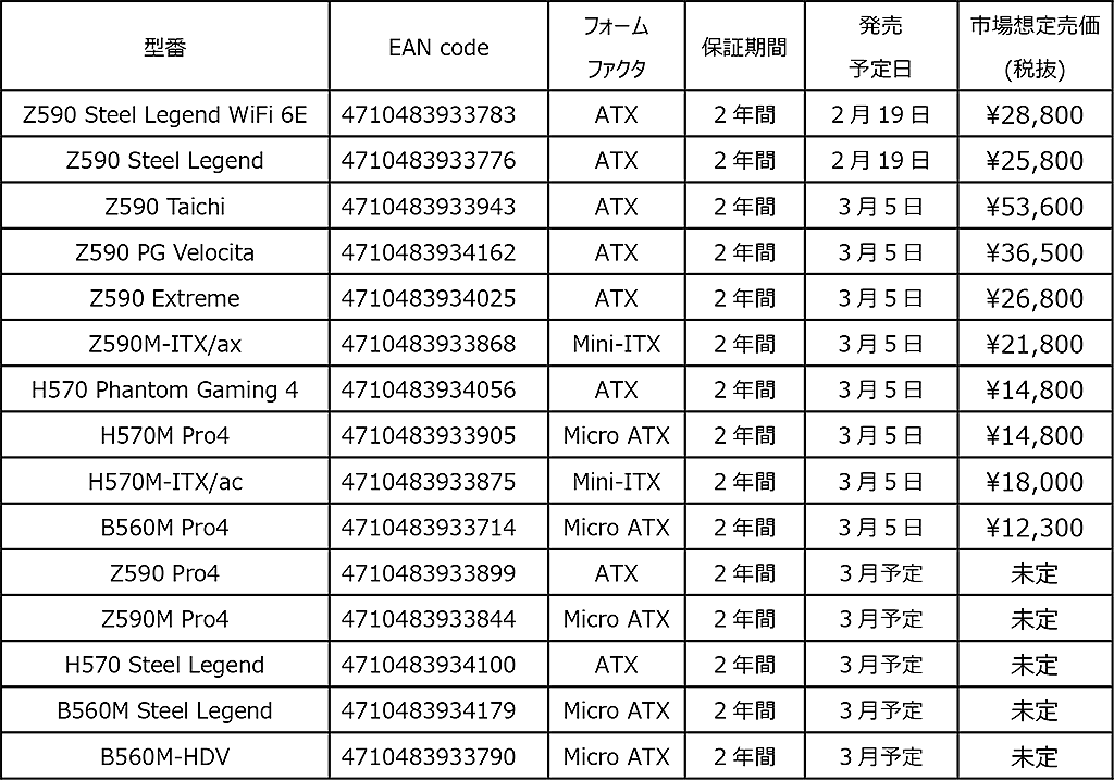 ASRock,Intel 500シリーズチップセット搭載マザーを2月19日より発売