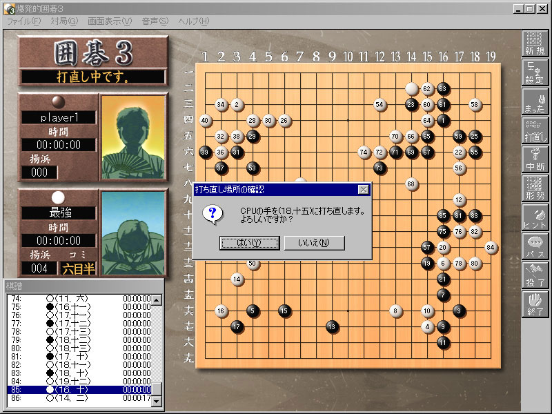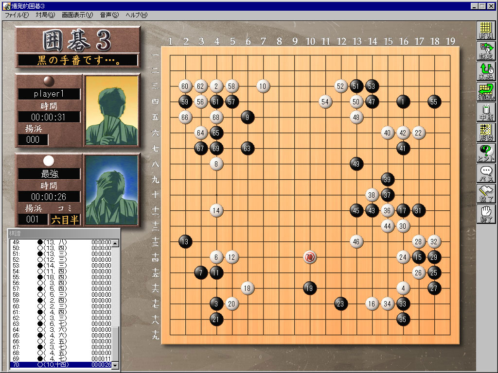 日本棋院からアマ「初段」に認定された本作が,低価格で人気の「爆発的1480シリーズ」に登場。ちょっと気になる要素は,コンピュータが打った疑問手をプレイヤーが打ち直せる"打ち直し"機能(よくある「待った機能」ではない)。そのほかにも,対局中にプレイヤーの形勢をグラフィックスで表現する機能などが搭載されている。 |