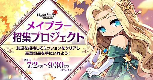 オンラインゲームの制作及び運用を行う株式会社ネクソン(本社:東京都港区、代表取締役社長:李 政憲/イ・ジョンホン、東証:3659、以下 ネクソン)は、PC向けにサービス提供中のオンラインMMORPG『メイプルストーリー』にて、2025年7月2日(水)より、友達招待キャンペーン「メイプラー招集プロジェクト」を開始いたしました。