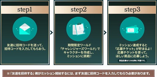 2. 招待された方がコードを入力すると、ミッションに挑戦できるようになります。ゲーム内の期間限定ワールド「チャレンジャーズワールド」でキャラクターを作成し、各ミッションに挑戦します。