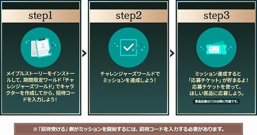 現在『メイプルストーリー』をプレイしている方は、特設サイトで発行できる招待コードを使って、はじめて『メイプルストーリー』をプレイする方や、久しぶりにプレイする方をゲームに招待することができます。招待したプレイヤーと、ゲーム内でキャラクター育成やボス討伐などのミッションに挑戦しましょう。各ミッションをクリアすると、「応募チケット」が獲得でき、集めた応募チケットを使って、ゲーミングPCや『メイプルストーリー』オリジナルグッズなどのプレゼントにご応募いただけます。