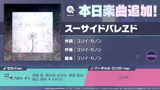 株式会社セガ(本社:東京都品川区、代表取締役 社長執行役員COO:内海州史)と株式会社Colorful Palette(本社:東京都渋谷区、代表取締役社長:近藤裕一郎)は、iOS/Android向けリズム&アドベンチャー『プロジェクトセカイ カラフルステージ! feat. 初音ミク(以下、プロジェクトセカイ)』について、2025年4月14日(月)より、新たに「スーサイドパレヱド」(作詞・作曲:ユリイ・カノン)をリズムゲーム楽曲に追加いたしました。