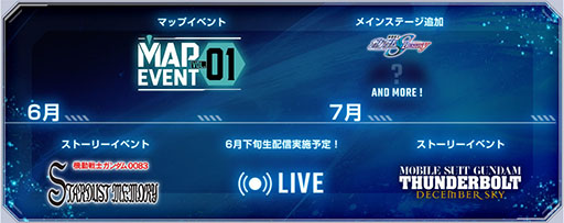今後のロードマップも公開された。6月下旬にはプロデューサーによる生配信が実施され,ゲームのアップデート情報が発表される。また,メインステージ「機動戦士ガンダムSEED DESTINY」は6月下旬から7月上旬頃に追加予定で,ストーリーイベント「機動戦士ガンダム サンダーボルト DECEMBER SKY」は7月中旬頃の開催予定となっている。
