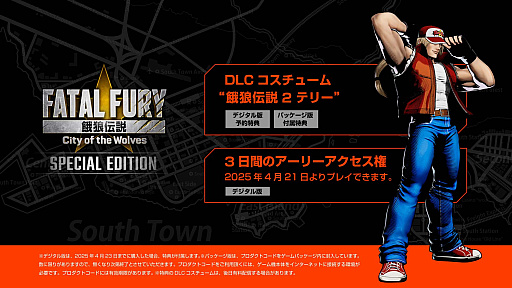 DLCコスチューム“餓狼伝説2 テリー”は、デジタル版では、2025年4月23日までに購入した場合の予約特典です。パッケージ版は、付属特典としてDLCコスチューム“餓狼伝説2 テリー”のプロダクトコードをゲームパッケージ内に封入しています。