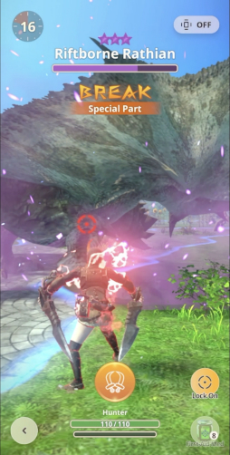 次元変異モンスターには,特殊な次元のエネルギーが集中し,紫のオーラを纏った部位があり,このオーラがあるうちは極めて耐久力が高い。会場で実際に狩猟したところ,この部位を破壊すると明確に弱体化し,ダメージが通りやすくなることが確認できた。