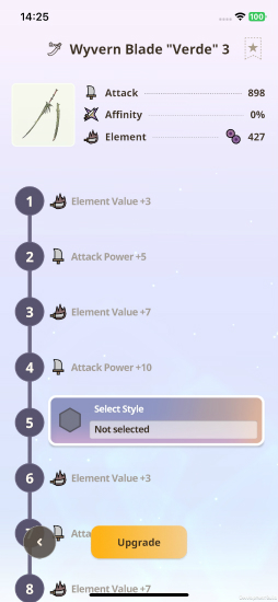基本的には,モンスターの素材を使ってレベルを上げていくことで武器のステータスが上昇していくレベル5に到達すると,2つのスタイルからいずれかを選べるようになるが,このとき次元変異モンスターの素材と,既存の★9〜10モンスターから獲得できる新たな専用素材が必要となるので,かなりハードルが高い。