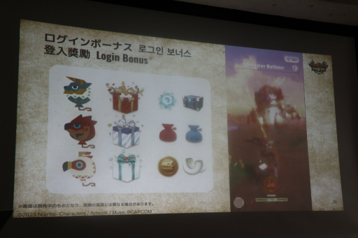 新たにログインボーナスも登場し,本作ではログイン後にフィールドに出現したバルーンを攻撃することで報酬を受け取れる。バルーンはレア度の低い順にクルルヤック,リオレウス,ジンオウガの形をしており,レア度が高いほど報酬が豪華になる。
