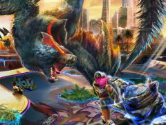 キービジュアルの背景も,スピード感をイメージさせるスケートボードパークとなっている。さらに手前のハンターが装備している武器は,本シーズンでついに実装される新武器種「狩猟笛」である。
