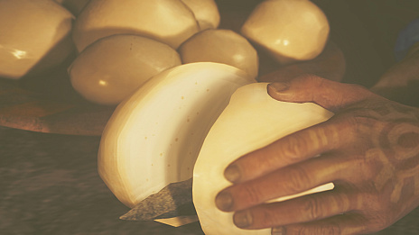 チーズに関してはまず,作中の料理内で使用できる,クナファ村の特産品「クナファチーズ」の記述から見ていきました。とのことです。クナファチーズは作中の映像表現でも,熱すると伸びる系のハードタイプなチーズとなっています。原材料がセクレトの乳なのかは不明ですが,消去法的にそうと見てもよさそうな? あるいは村が襲撃されたときに逃がしていた,家畜のほうかもしれません。