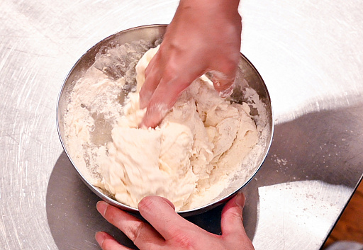 あとはひたすら混ぜて,こねて,生地が手にくっつかなくなったらいったん完成です。ラップをかけて30分放置(一次発酵)しましょう。