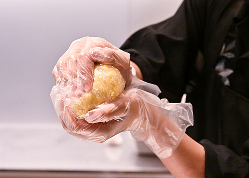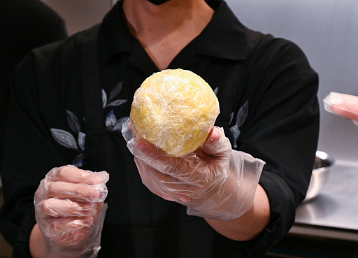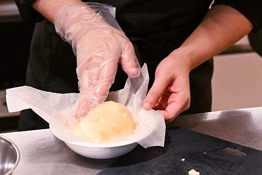 短冊状に細切れにされたシュレッドチーズは,複数種類のチーズが混合されている(ものが多い),いろいろな料理のちょい乗せにうってつけの製品です。現場ではクナファチーズの形状を再現するべく,“サランラップで球状に丸めてレンチンする”ことにしました。