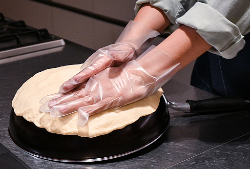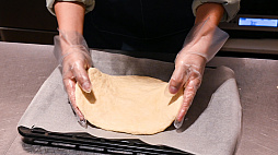 発酵が済んだら,生地に強力粉で打ち粉をして,手や綿棒で丸く広げていきます。クナファ村のナンは顔よりも大きく,かつ素朴な厚みがあるので,再現するなら雑めにやるほうが粋です。大きさのイメージは,“宅配ピザの最小サイズ”(20cm〜)ほどとしました。