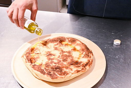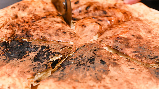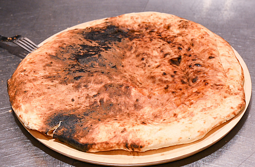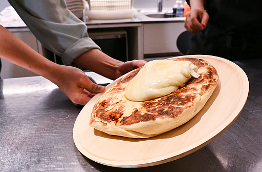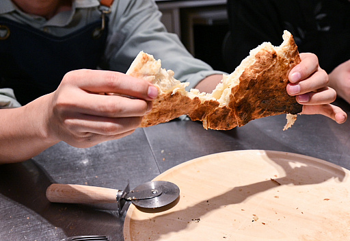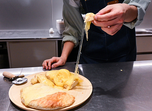一般的なチーズナンは「ナンの内部にチーズが入っている」のですが,ワイルズナンは「ナンの上に熱々トロトロのチーズを乗せる」といった形状です。食べ方も,円形の大きなナンをピザのように切り分けることもなく,丸ごと1枚をガブリといくクナファスタイルです。