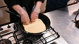 張り付けた生地は,焼いている途中も落ちません。フライパンに面している側が焼けることで,しっかりとへばりついてくれます。そのぶん,焼きすぎると剥がすのに一手間かかるので注意が必要です。