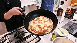 チーズを乗せた直後,「なんかちょっと違う〜」の大合唱が。熱が入りやすいかと思ってシュレッドチーズを選んだのですが,どうも内部の加熱が足りず,球状が残ってしまったみたいです。とはいえ,球体部分も熱々トロトロの柔らか状態なので,食器でつぶせば問題なし。