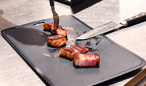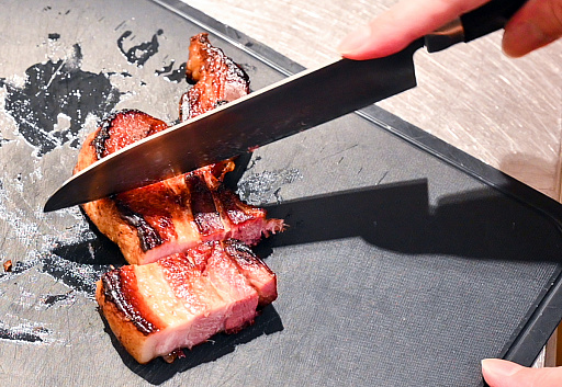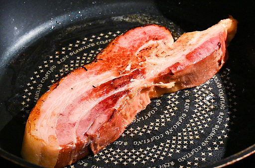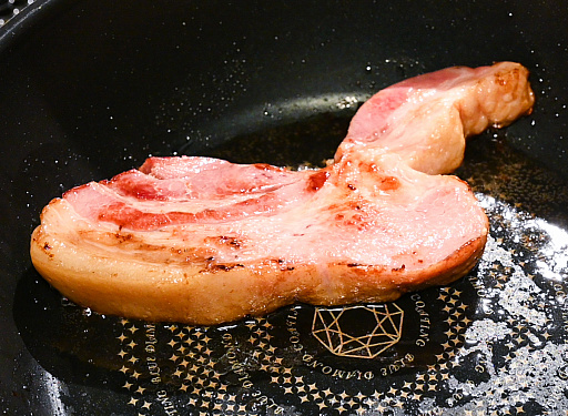 焼き時間は強火で30秒,中火で4分,裏返して4分といったところ。厚みのせいで一般的なレシピの目安時間は通用しないものの,細かいことはワイルドにいきましょう。ちなみに1食目でテンションが上がった我々は,調子に乗って厚切りベーコンも焼きはじめました。