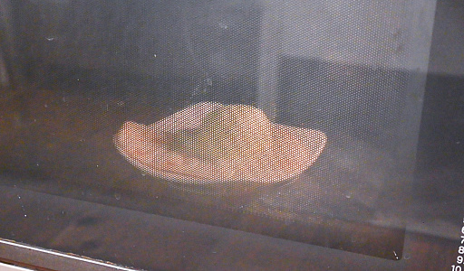さて,もったいぶった裏技焼きですが,こちらは「ナン生地を,フライパンの裏側に張り付けて,コンロの直火であぶる」というものです。ICクッキングヒーターではできない,文字通りの裏技です。