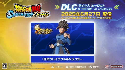 さらに、追加DLC「サイヤ人 シャロット(ドラゴンボール レジェンズ)」は、好評発売中の「シーズンパス」にも新たに追加されます!「シーズンパス」購入者は、72時間のアーリーアクセスも可能となるので、いち早く「シャロット」を手に入れたい方はお見逃しなく!