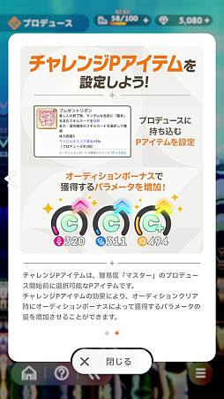CPアイテムはさまざまな付与効果をもたらすメリットと,オーディションでライバルのスコアが増加するデメリットが設定されており,持ち込むことで“オーディションボーナス獲得パラメータ”が上昇する。