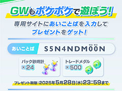 こちらのあいことばは,GWを記念して公開されたものだ。専用サイトであいことば「S5N4NDM00N」とサポートIDを入力すると,「パック砂時計×24」「トレードメダル×500」が手に入る。入力期限は5月28日までだ。