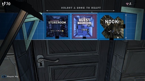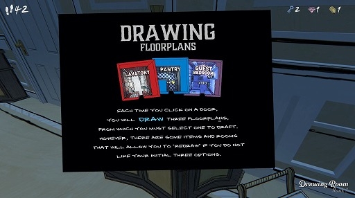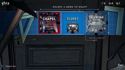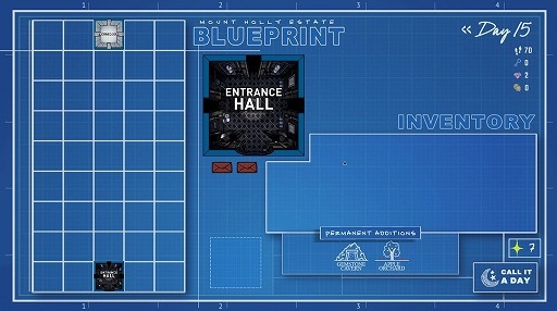 この屋敷は不思議な構造をしており,最大45個の四角い部屋(5×9マス)で構成されている。サイモンがやってきた時点では,エントランス以外の部屋は配置が決まっておらず,3つの選択肢から1つを選んでブループリント(設計図)に書き込むことで,扉の先につながる部屋を決められる。