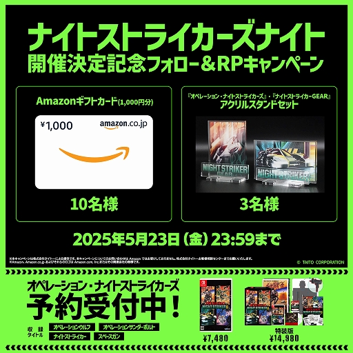 本日より5月23日(金)までの期間中、「ナイトストライカー」、「ナイトストライカーGEAR」のアクリルスタンドセットやAmazonギフトカードが当たるフォロー&リポストキャンペーンを開催いたします。詳細はタイトーゲーム公式Xをご確認ください。![]() |