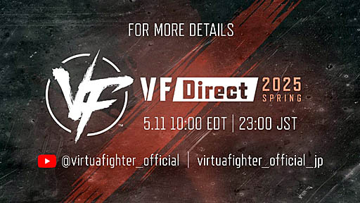 株式会社セガは、5月11日(日)23:00から、「バーチャファイター」シリーズの最新情報を紹介する番組“VF Direct 2025 Spring”をYouTubeにて配信いたします。