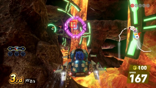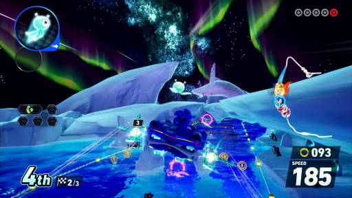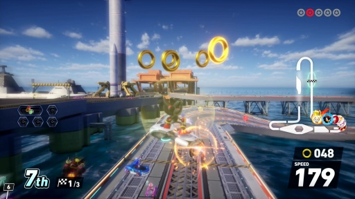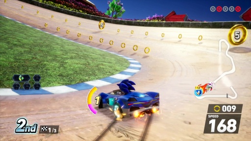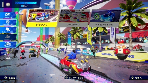 ここで注目すべきは,ダッシュカテゴリのマシンはレースカーではなく,2006年にリリースされた「ソニックライダーズ」に登場した浮遊するボード「エクストリームギア」であること。ボードに乗ったソニック達がレースカーに混ざって走る姿は,なかなか新鮮だった。